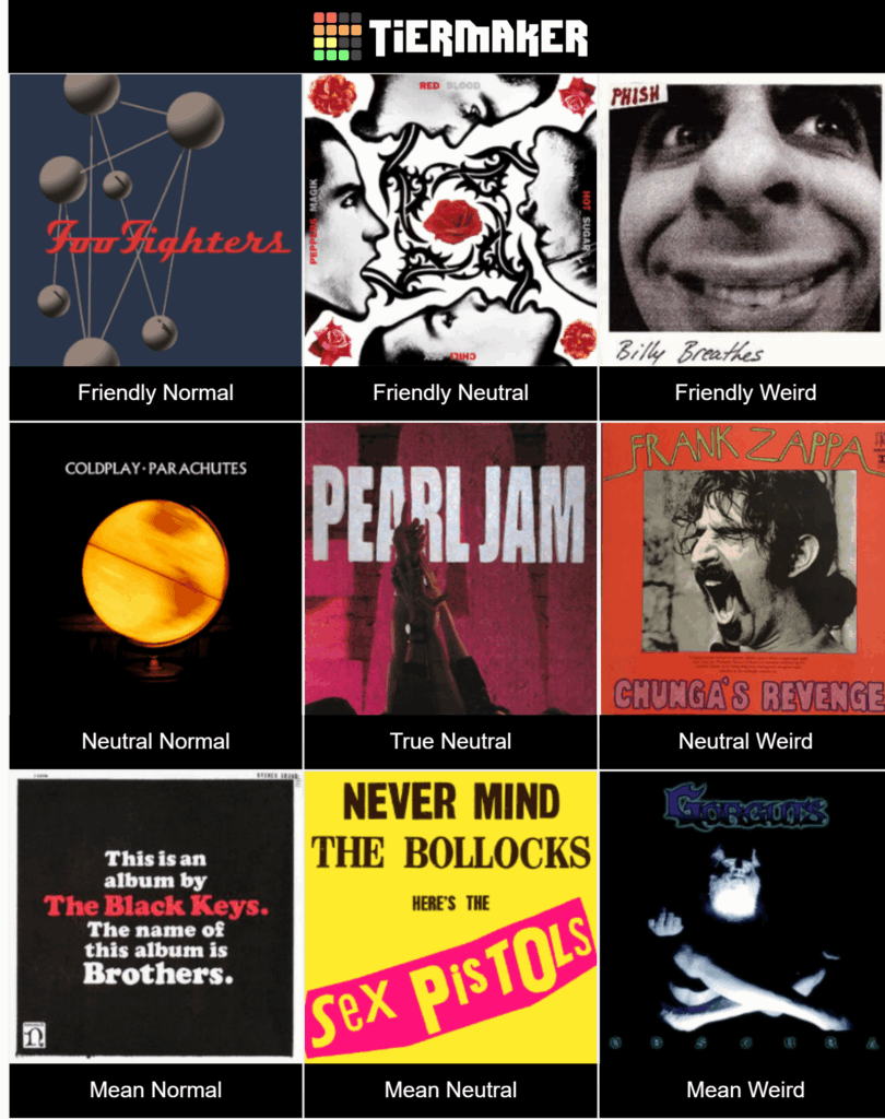 As you might suspect, whether a band is friendly or not is a vibes thing. If you refer to the “Friendly” section of the chart you’ll see bands like the Foo Fighters, Red Hot Chili Peppers, and Phish. The Foo Fighters are a bastion of rock positivity because Dave Grohl is essentially a Labrador retriever. His persona makes the band friendly, even when their songs – and the band’s history – have gotten dark. Similarly, the Red Hot Chili Peppers have taken the mantle as a “friendly” rock band as its members have matured. Quite frankly, their appreciation for being alive and still playing together is something other bands should find inspirational. They also seem to give a shit about womens pleasure in their many, many fuck songs. Phish, another band with dark patches in their history, are “friendly” by dint of the inclusion of their fanbase. Phish fans exist seemingly to create more Phish fans. This is a band that seemingly revels in bringing people together and making them feel good. (That’s also what the drugs are for.)
